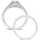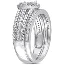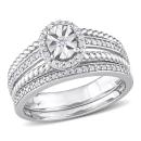 This pretty oval halo bridal ring set is crafted in lustrous sterling silver. This stunning ring set features 73 round-cut glowing diamonds that are beautifully embellished on the ring set in prong and pave settings. This unique wedding ring is complemented by a matching stackable semi-eternity style wedding band. Enhanced with a high polished finish, this halo diamond bridal set is a perfect symbol of your everlasting love and a beautiful addition to any jewellery collection.