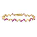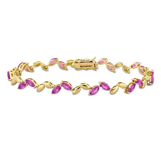Introducing our radiant 9 1/2 CT TGW Created Pink Sapphire Bracelet in Yellow Plated Sterling Silver —a harmonious blend of opulence and modern elegance. This captivating bracelet features a stunning array of created pink sapphires set against a lustrous yellow-plated sterling silver backdrop, creating a piece that exudes sophistication and timeless allure. The rosy pink hues of the sapphires come to life against the warm embrace of the yellow-plated sterling silver, evoking a sense of femininity and grace. Each carefully faceted gemstone is designed to maximize brilliance, ensuring the bracelet captivates with a dazzling display of colour.