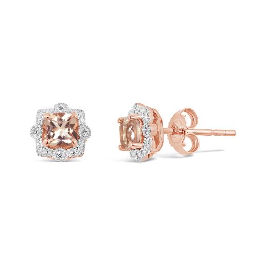 Crafted in gleaming rose gold, these delicate earrings feature two cushion cut morganite stones at their centre encircled with shimmering diamonds. Enhanced with a high polish finish, these divine morganite and diamond earrings are the perfect choice for your sweetheart.