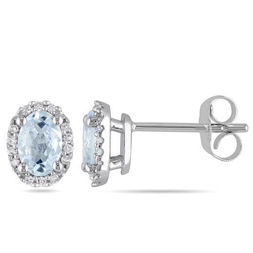 These stylish earrings each feature an oval-cut aquamarine stone surrounded by a halo of round white diamonds. This pretty pair is set in 10-karat white gold and are secured with butterfly backs.