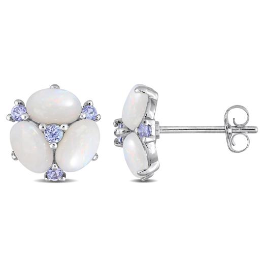 These oval-cut opal flower earrings are crafted in 14-karat white gold. These lovely stud earrings feature six oval-cut, prong-set opal gemstones along with eight round-cut sparkling white diamonds in a unique floral clustered design. Coordinate these stunning gemstone and diamond earrings with any ensemble from business, casual to everyday wear and look gorgeous. Choose this gorgeous jewellery either for yourself or as a special gift for someone you love.