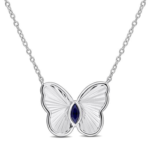Add a touch of enchantment to your ensemble with these exquisite 1/4ct TGW Marquise-Cut Created Blue Sapphire Butterfly Stud Earrings, delicately crafted in Sterling Silver. The intricate butterfly design, adorned with vibrant marquise-cut created blue sapphires, exudes charm and sophistication. Perfect for elevating both casual and formal looks, these earrings are sure to catch the eye and spark admiration. Embrace the timeless beauty of butterflies and the deep allure of blue sapphires with this stunning pair that effortlessly complements your style with its graceful allure.