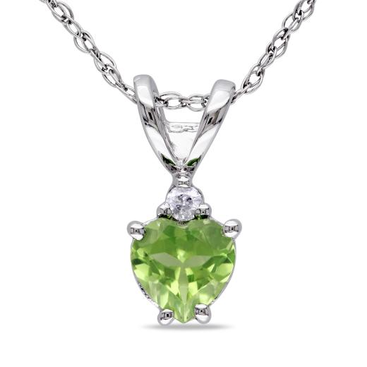 This lovely necklace features a heart-cut peridot stone topped by a round white diamond accent set in 10-karat white gold. This stunning pendant is hung on a rope chain and secures with a spring ring clasp.