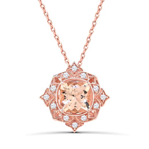 This modern and sophisticated pendant is crafted in lustrous 10-karat rose gold and features a cushion-cut morganite stone at the centre, accented with white sapphires. This pendant is sure to be the perfect gift either for yourself or your loved one.