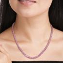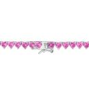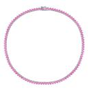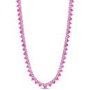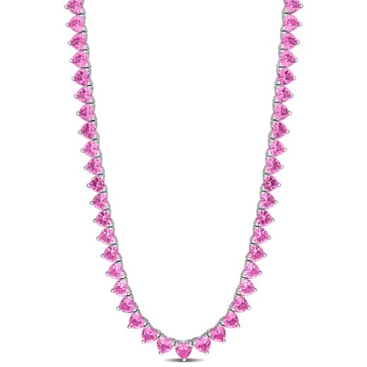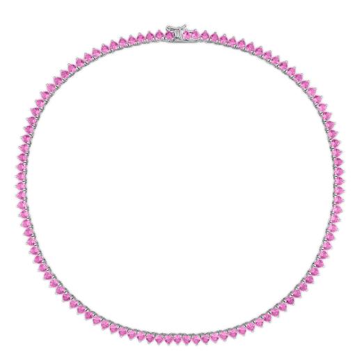 This glamorous pink sapphire tennis necklace is crafted in luminous sterling silver and is a stunning piece. This chic necklace showcases 104 heart-cut, prong-set created pink sapphire gemstones arranged in a tennis design. Enhanced with a polished finish, this magnificent necklace measures 18-inches in length and secures with a tongue and groove clasp. An ideal gift for a woman who loves to get on her glam, this necklace pairs well with a pink cocktail dress.