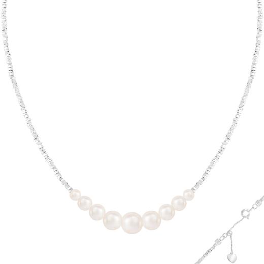 This elegant necklace features a beautiful collection of white freshwater pearls, ranging from 4mm to 8mm in size, strung together to create a timeless design. The 18-inch length, with an additional 1-inch extender, ensures a perfect fit and versatility for different necklines. The lustrous pearls add a touch of sophistication and natural beauty, making this necklace ideal for both everyday wear and special occasions.