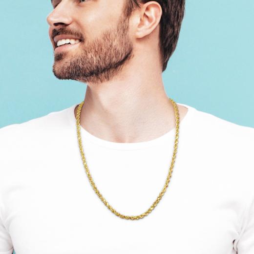 Create a buzz when you wear this striking Men's Rope Chain Necklace. Crafted in lustrous yellow gold, it features a high polish 5mm wide rope chain. This glamorous necklace is 24-inches long and secures with a lobster clasp. An elegant piece of jewelry, this alluring gold necklace is the perfect addition to any accessory collection.