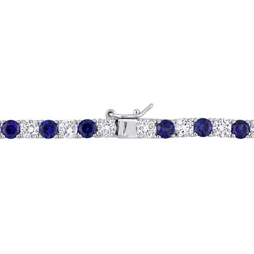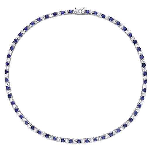 An ideal gift for a woman who loves to get on her glam, this Created Alternating White and Blue Sapphire Tennis Bracelet and Necklace Set is indeed a stunning piece. Crafted in lustrous sterling silver, this dual-colour 17-inches long stylish necklace showcases 51 round white created sapphire (4x4mm) and 52 round created blue sapphire (4x4mm) gemstones. The matching classy, 7.25" long bracelet features 42 round white and blue created sapphire (4x4mm) gemstones set in an alternating fashion. Finished with a brilliant shine, the necklace, and the bracelet set are secured with a tongue and groove clasp. Coordinate with a beautiful blue cocktail dress for a flattering look.