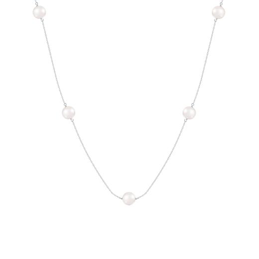 Understated elegance meets modern refinement in this 14K white gold tin-cup necklace, featuring five radiant 7mm freshwater pearls. The cool shimmer of white gold perfectly complements the soft luster of each pearl, creating a graceful rhythm that feels effortlessly luxurious.