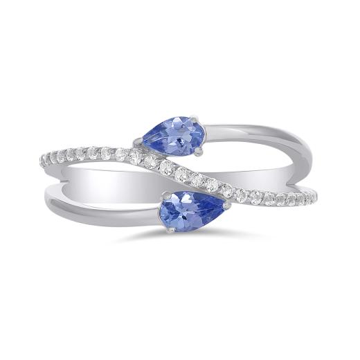 This stylishly modern ring features two pear cut tanzanite gemstones accented by a swirl of white topaz gemstones. This 10k white gold ring glimmers with a highly polished finish. Buy this gorgeous piece for yourself or for that special someone in your life!
