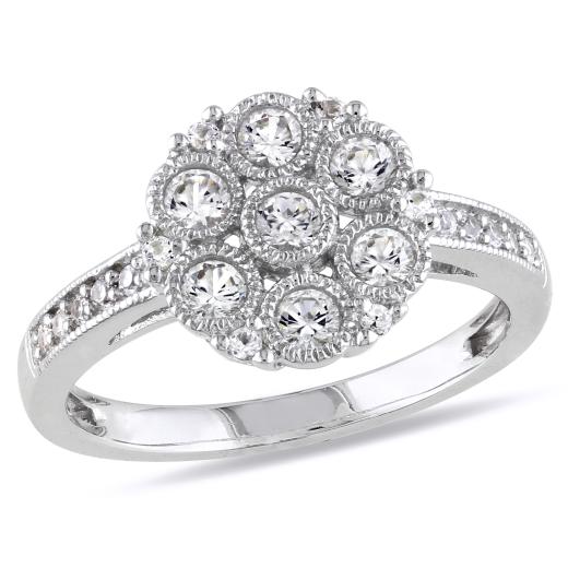 This gorgeous ring features round-cut created white sapphires that resemble diamonds. The ring is set in sterling silver and is adorned by miligrain detailing.