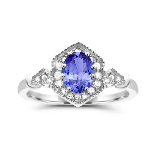 This charming classic ring features a gorgeous oval cut tanzanite surrounded by shimmering white sapphires. This ring is crafted in lustrous 10K white gold and is sure to become a favourite in your jewellery collection.
