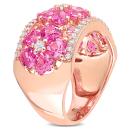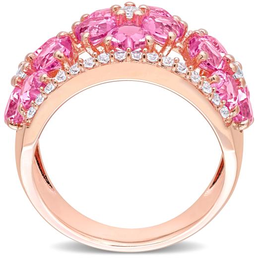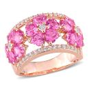 This created sapphire floral cocktail ring is crafted in rose plated sterling silver. This modern ring features 15 heart-cut created pink sapphires along with 35 round-cut created white sapphires in a unique triple flower semi-eternity design. Instantly add a touch of color, elegance and class to any ensemble with this stunning gemstone ring. A perfect choice either for yourself or as a special gift for someone you love. This statement ring will make a standout addition to any jewelry collection.