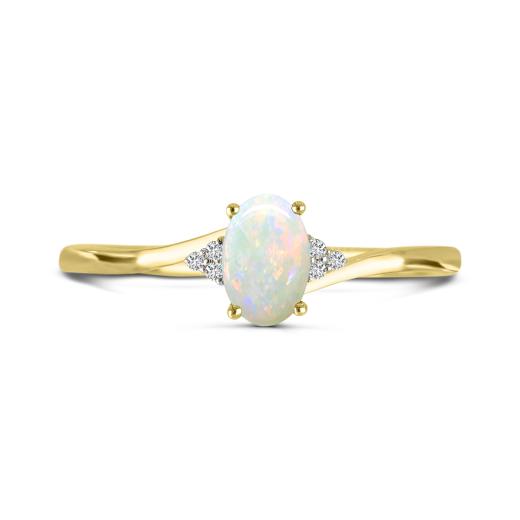 This 10K yellow gold ring features a luminous opal that shimmers with soft iridescence and natural elegance. A delicate accent of diamonds adds a gentle sparkle that complements its ethereal glow. With its warm golden tone and captivating play of colour, this ring is a timeless celebration of beauty and individuality.